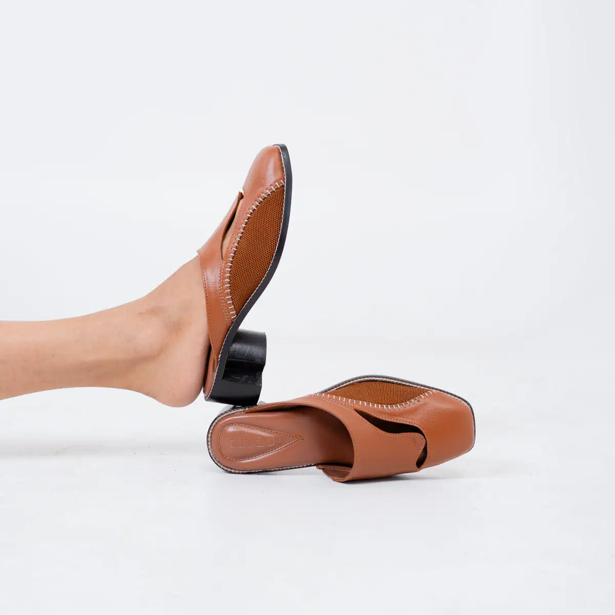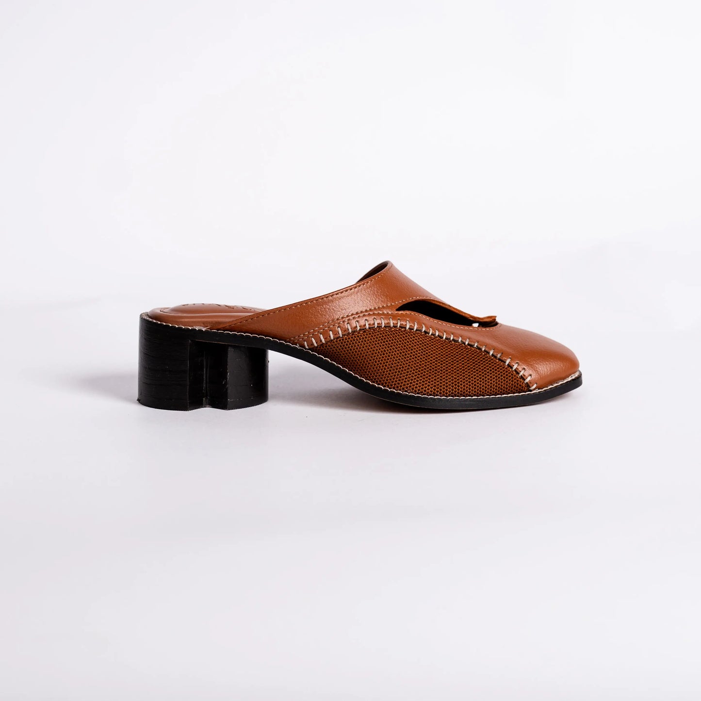 Brown leather mule shoe on a white background