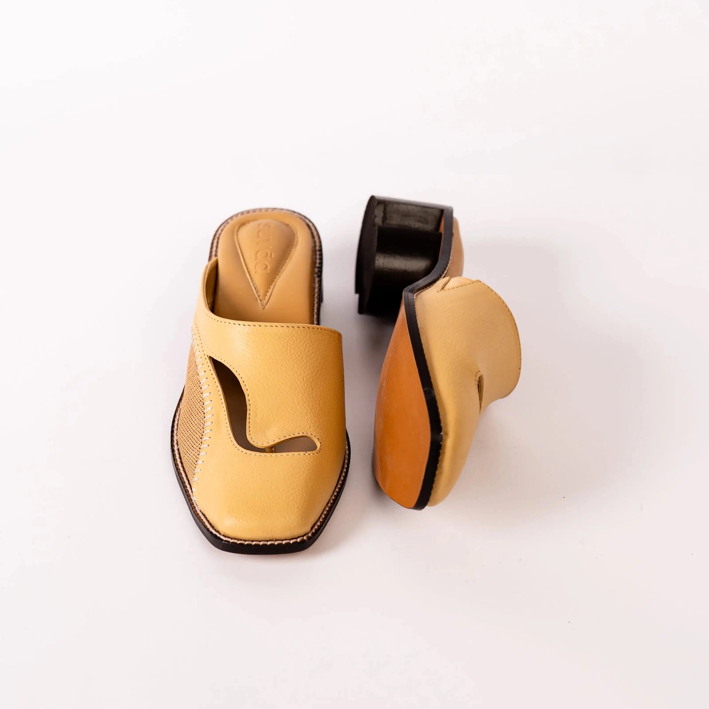 Yellow mules with chestnut brown sole on a white background.